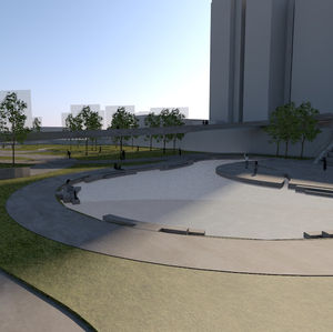 A pista de skate e a quadra poliesportiva se encontra a 1,50 m abaixo da cota padrão da praça, fazendo com que a escada se transforme em uma arquibancada.