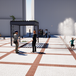 - Para garantir a acessibilidade e interligar os 5 módulos da praça foi proposto nivelar as faixas de pedestre com o nível da calçada com a mesma tipologia de piso.